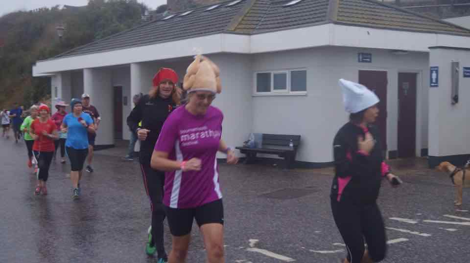Nick and I headed off to Seaton's first anniversary run. Their theme was 'hats' and there were all sorts: a cake with candles, woolly ones, party ones, tartan ones, umbrella ones. A chance for me to crack out the Christmas Turkey hat, which proved surprisingly warm! There were thanks and presents to the most prolific volunteers and runners during their inaugural year. One lady had volunteered a notable 48 times. The only cancellation during their first year had been due to storm 'Doris' depositing the contents of the beach on the esplanade one Saturday morning. This week we were spared a beach start, but there were still a couple of challenging beach sections and the finish funnel was on the beach. Good Grizzly training. It is a very friendly and welcoming run.